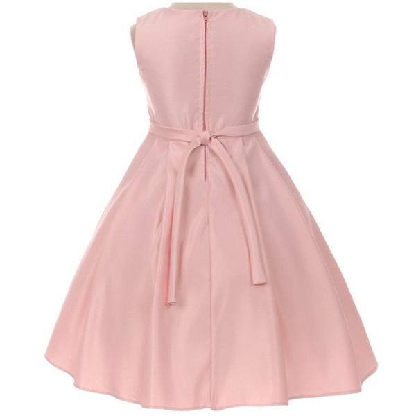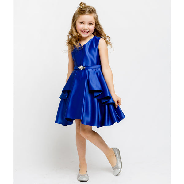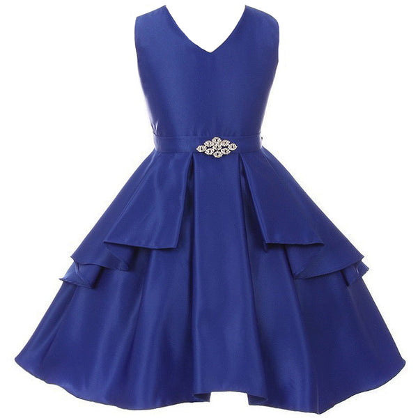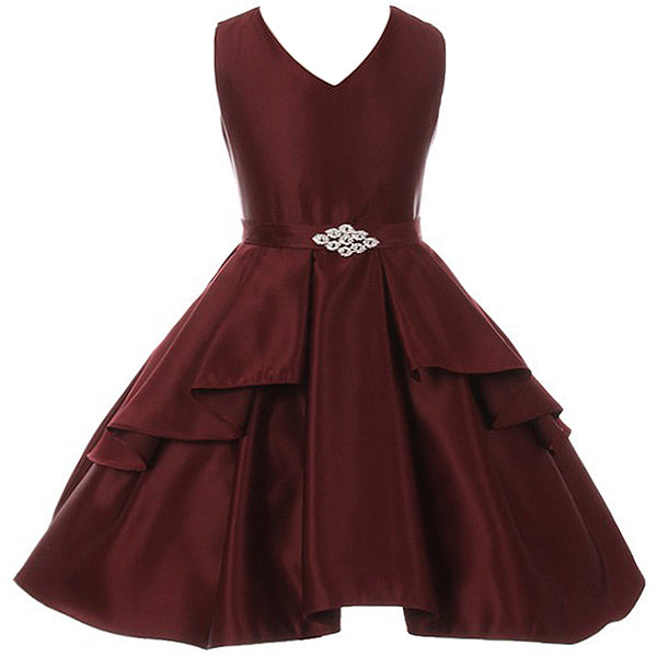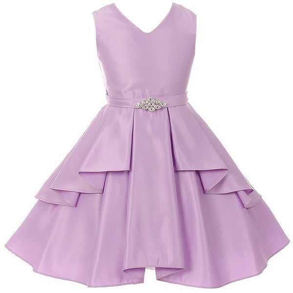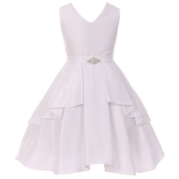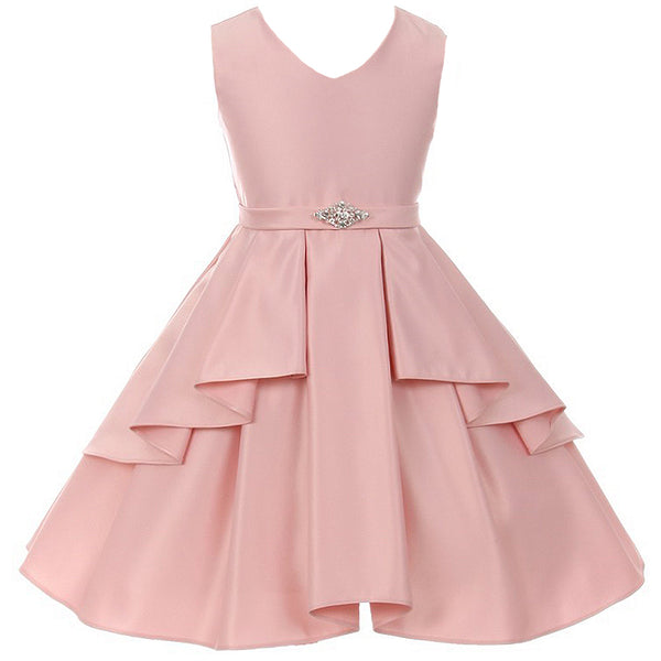 V-neck pleated skirt dull satin girl dress. Rhinestone brooch ornamented the waist. Ruffle overlay pleated skirt create signature to this dress. Adjustable waist with satin sash. Knee length. Center back zipper. Fully lined for comfort. Made in USA.